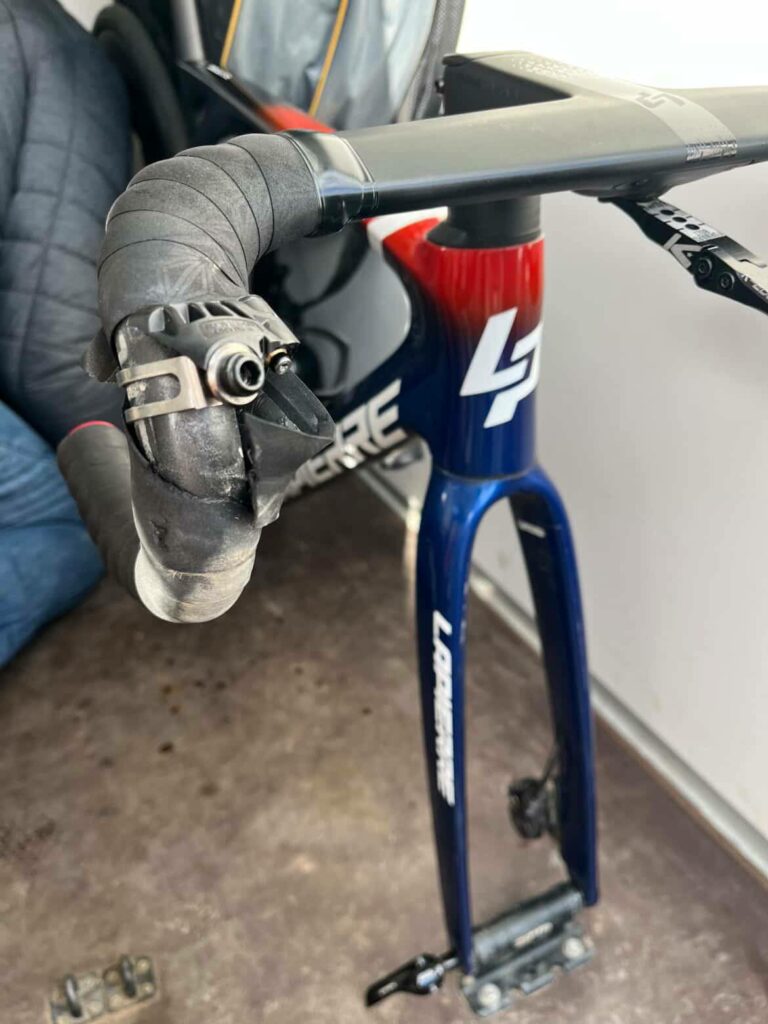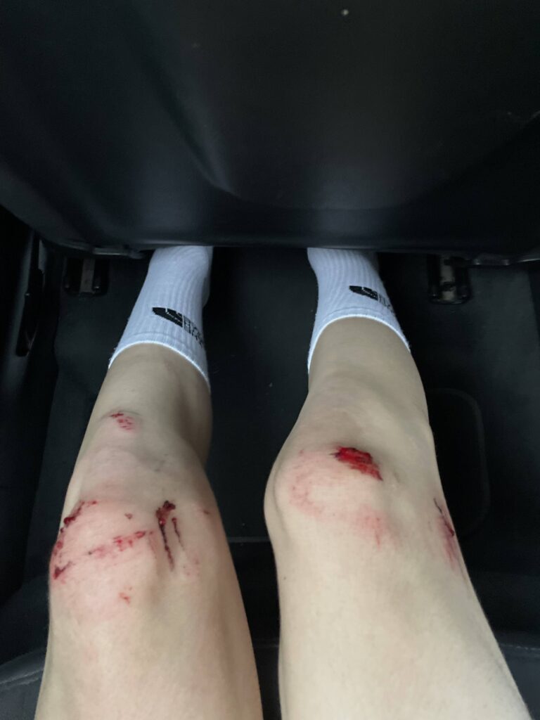 Jules évite la chute, mais se fait percuter par l’arrière, ce qui occasionne également un beau soleil mais sur le goudron.